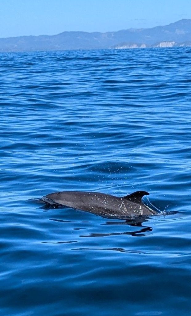 Nachdem ich den Schock über das Handy über Nacht wegatmen konnte, sind wir heute Morgen mit einer Gruppe zum Dolphin-Watching rausgefahren. Das erste, das wir sahen, war ein Thunfisch, der in einiger Entfernung vor unserem Boot einen Sprung in die Höhe machte. Kurz darauf sind viele Delfine mit und um unser Boot geschwommen.