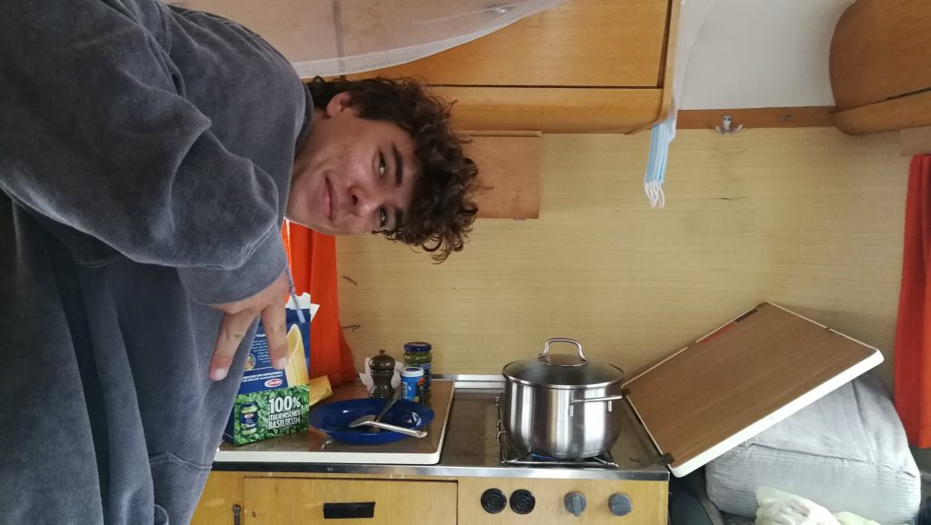 Nach ca. neun Stunden sind wir am Hafen von Ystad und warten auf unsere Fähre nach Bornholm. Um 18:30 soll diese nach Rönne ablegen. Hier ist gerade Sauwetter und es windet ganz ordentlich. Bruno nutzt die Zeit, sich ein paar Nudeln zu kochen.